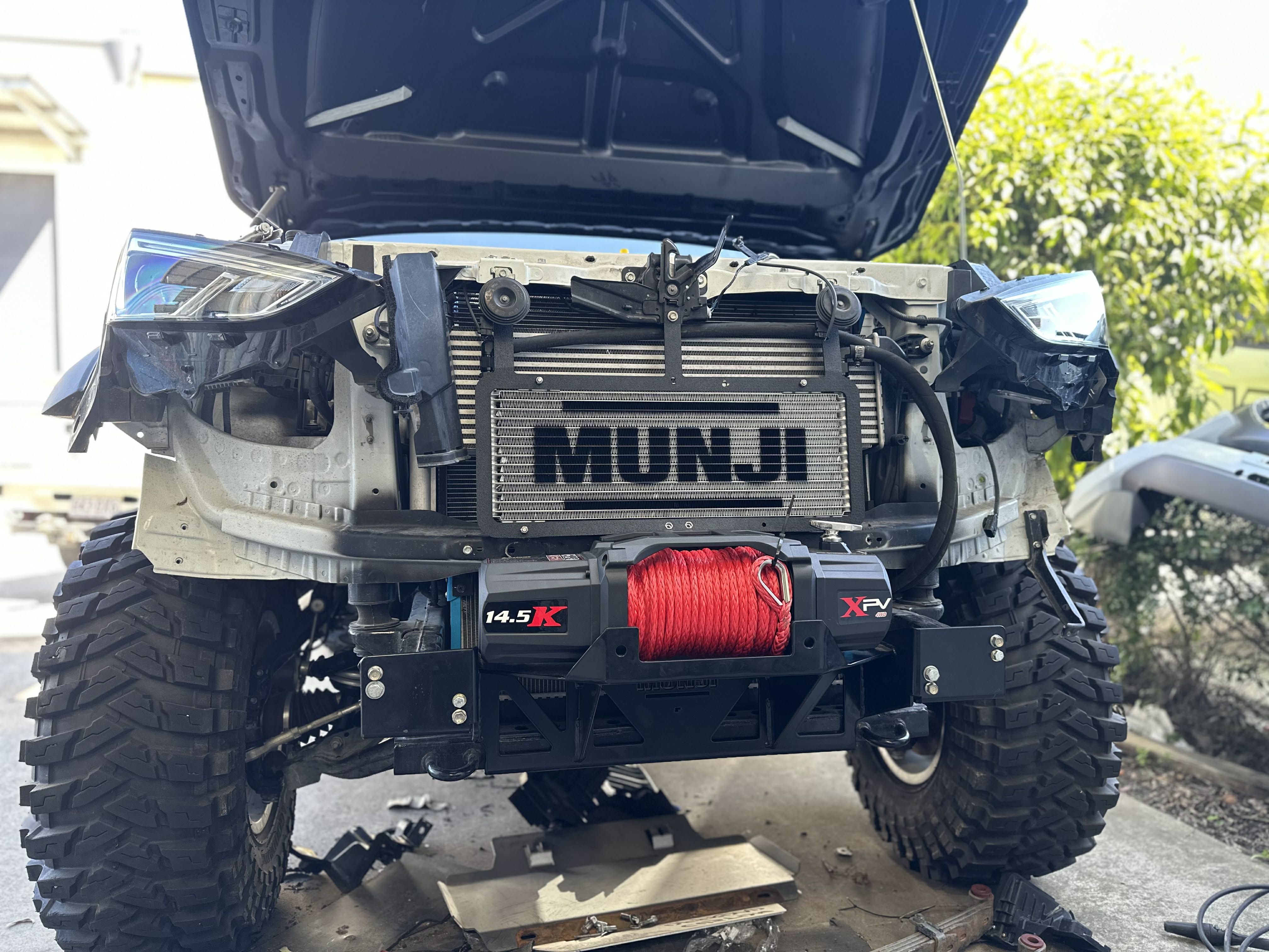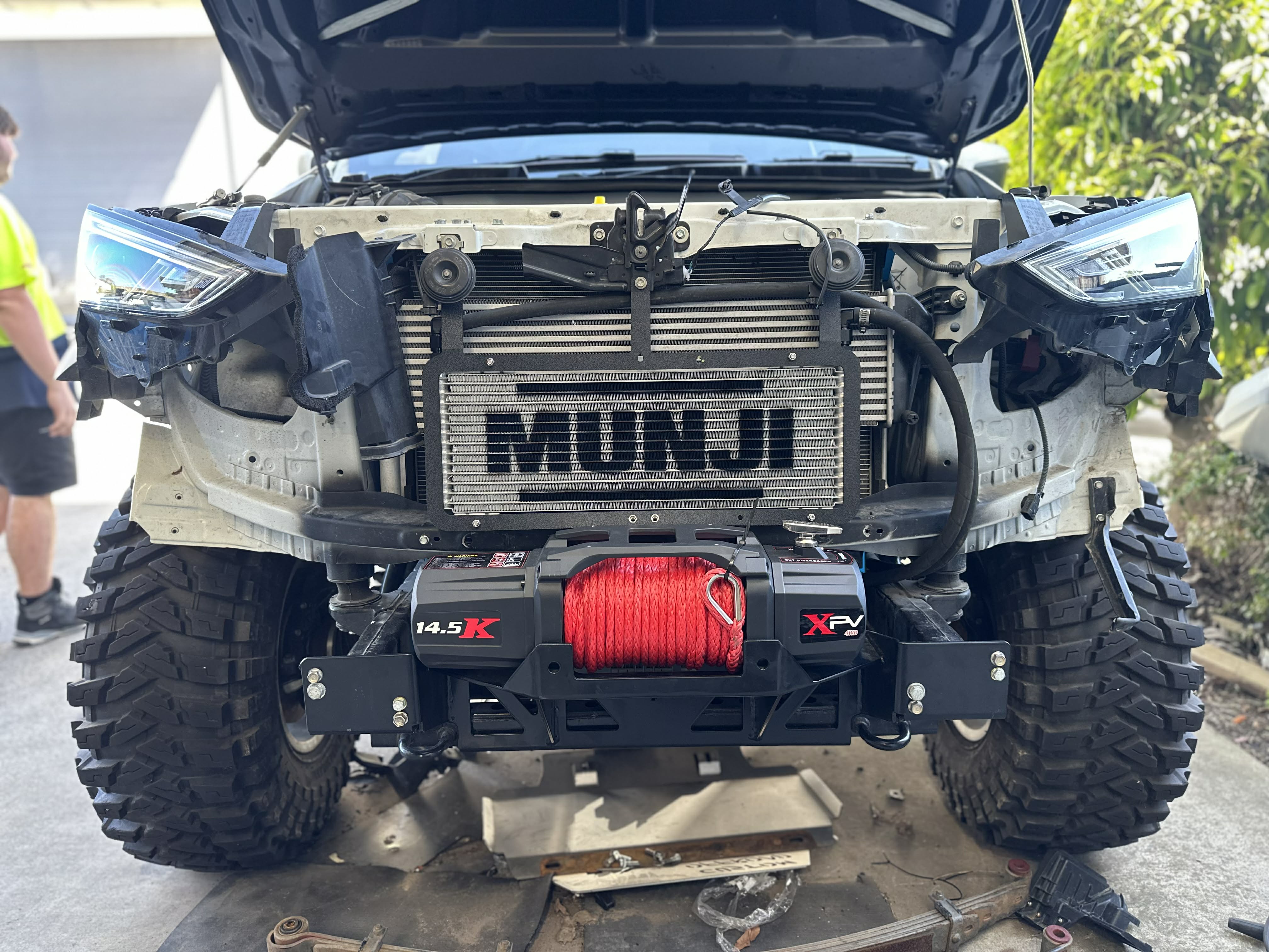 A Front mounted transmission cooler kit for the 2020 Onwards D-Max, MU-X and Mazda BT-50s. This kit comes with a Huge 45,000 BTU, Canadian made Fin and Plate Cooler from Tru-Cool. This is a fantastic oil cooler with massive surface area and minimal restriction. This kit also includes all brackets to make it bolt on, Oil Hose, Hose Clamps and AN Fittings for the oil lines. We have kept it as low as possible to maximise airflow to the intercooler, however there is also provision for 1 or 2 fans to be bolted to the mounting bracket, which aids with heatsoak and airflow to both the transmission cooler and intercooler!