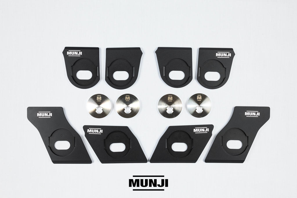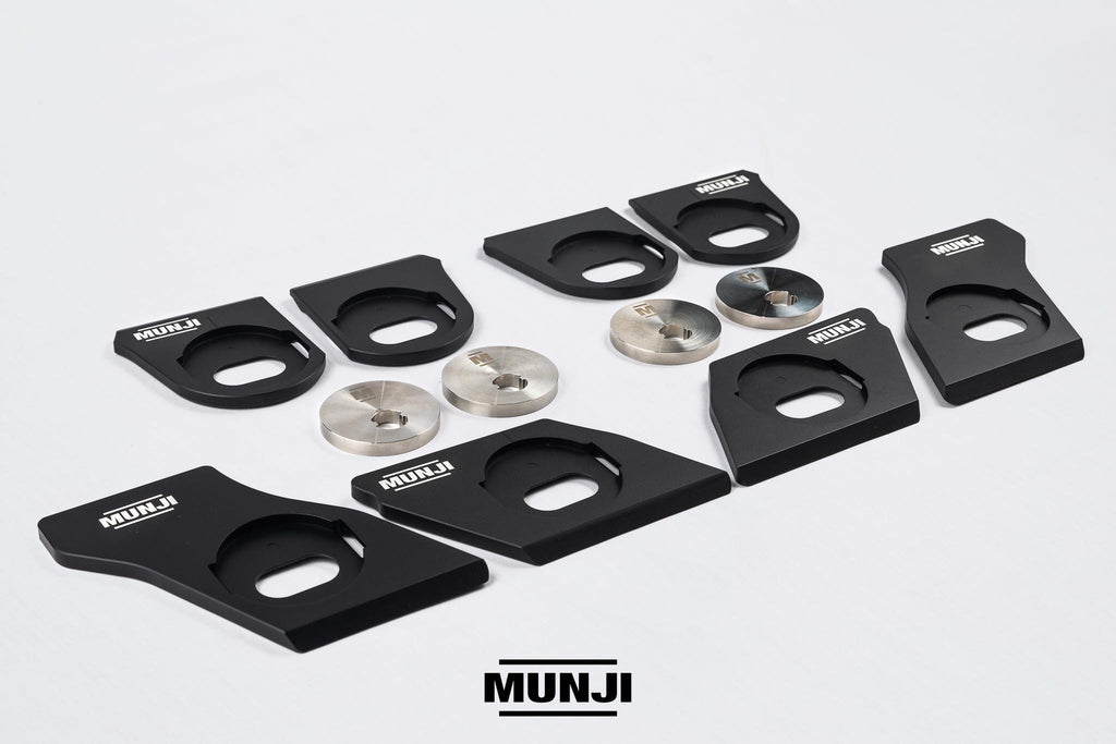 The reinforcement plates are CNC machined from Billet Aluminium and anodised to ensure a long lasting, high quality finish. These are a tight tolerance fit and may require some light taps with a hammer to fit over the factory tabs. The upgraded eccentric washers are precision CNC laser cut from Stainless Steel and also are a tight tolerance fit and may require some light taps with a hammer to fit the factory adjustment bolt.