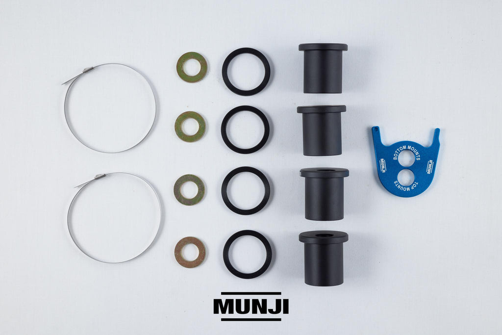 A set of Billet Aluminium Offset Bushes that drop the steering rack down to help fix the uneven tyre wear, which is due to the bad steering geometry that is skewed from factory. Nylon crush washers go in between the rack and chassis to keep the rack locked in place and aid in installing this kit. A checking tool is also provided to make sure the bushes are installed perfectly.