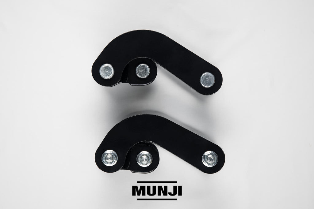 The shackles have been designed specifically to allow for smoother motion and more droop in the suspension over the conventional design.
